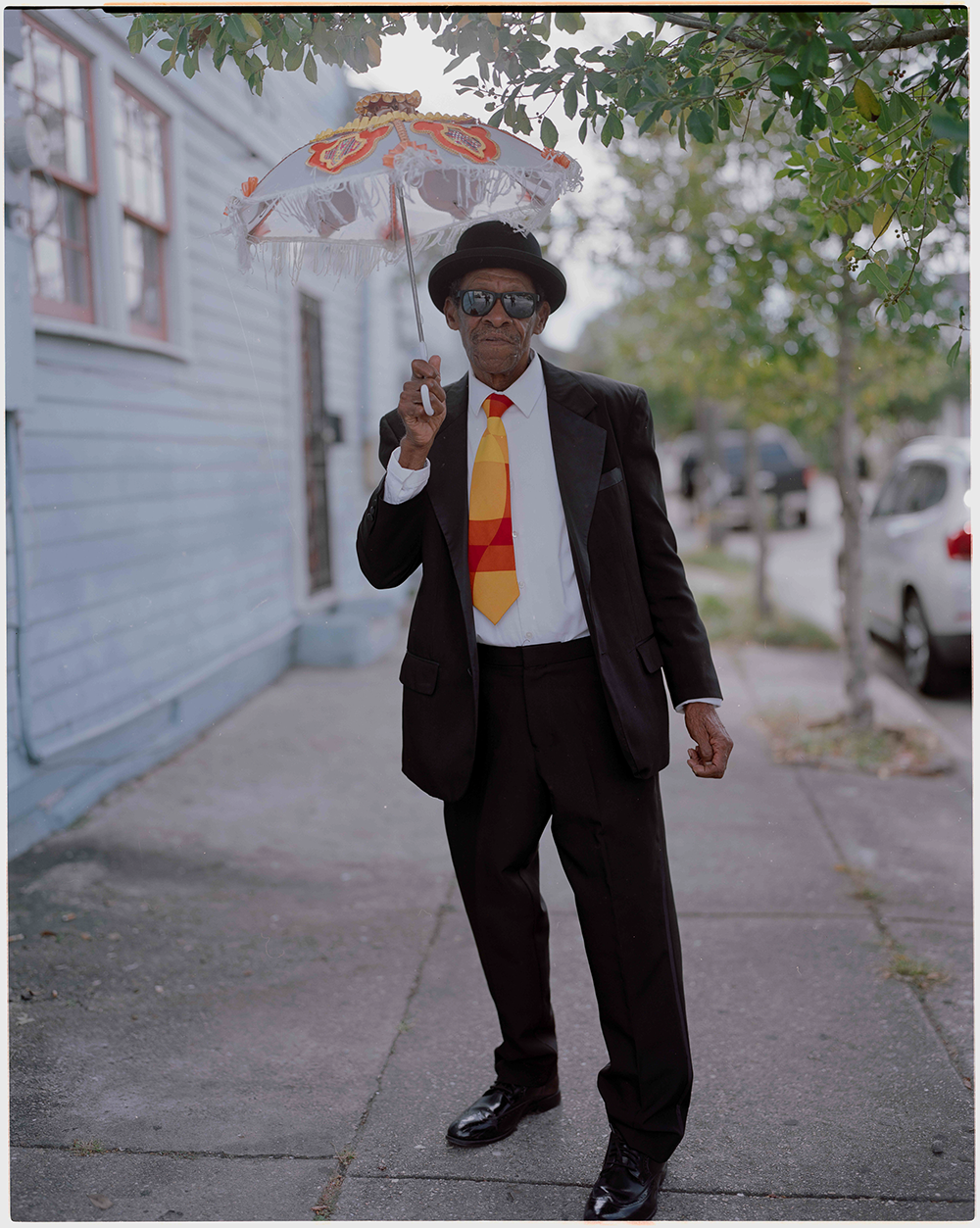A small second line passes by Backstreet Cultural Museum in the historical black neighborhood of Tremé, before making a stop at Tubafats Square. Photography by Brandon Holland.