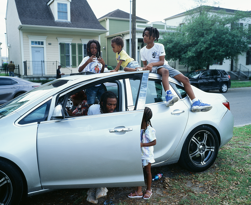Orleans Ave, Tremé, New Orleans. A young family waits, parked on the neutral ground, in anticipation of an oncoming second line, a community oriented jazz parade organized by one of the many Social Aid and Pleasure Clubs in the city. Photography by Brandon Holland.