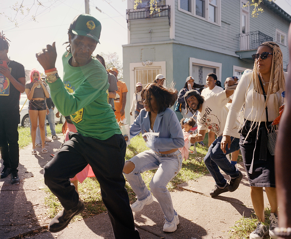 St. Bernard Avenue, 7th Ward, New Orleans. Footwork, the style of dancing born out of the second line tradition. Anyone in the neighborhood is welcome in. Each Sunday from fall to early summer second liners strut along to the beat of the brass band all throughout the city. Photography by Brandon Holland.