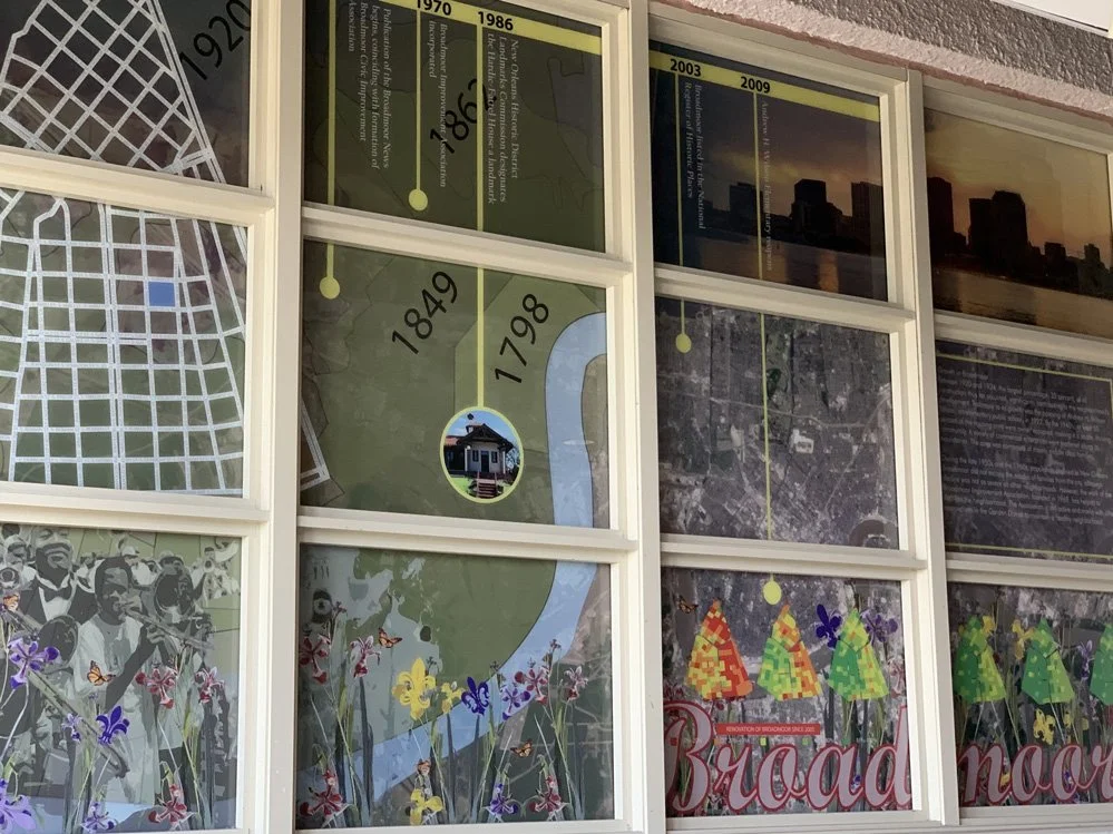 The windows that previously let light into the rooms at the end of the old building now frame an illustrated timeline of the surrounding community dating to the 1500s, tracing Louisiana’s admission to the Union, America’s 1815 defeat of the British in the Battle of New Orleans and Broadmoor’s slow evolution from a lake to a diverse, middle-class neighborhood that prizes its education legacy.