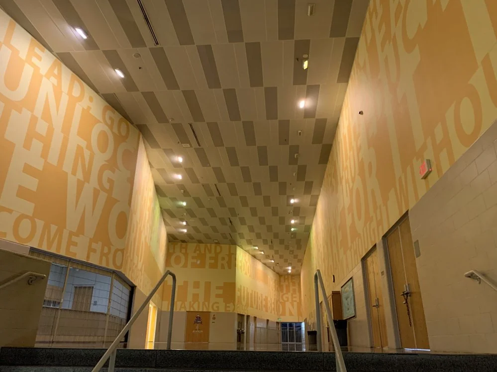 The halls branching off from the school’s office are behind glass walls. Everything in front of the dividers is protected by the landmark’s 2016 inclusion on the National Register of Historic Places. Behind the walls are classroom doors, which actually open onto apartments. A mural on the back of the building depicts the McDonogh 3 as both girls and women.