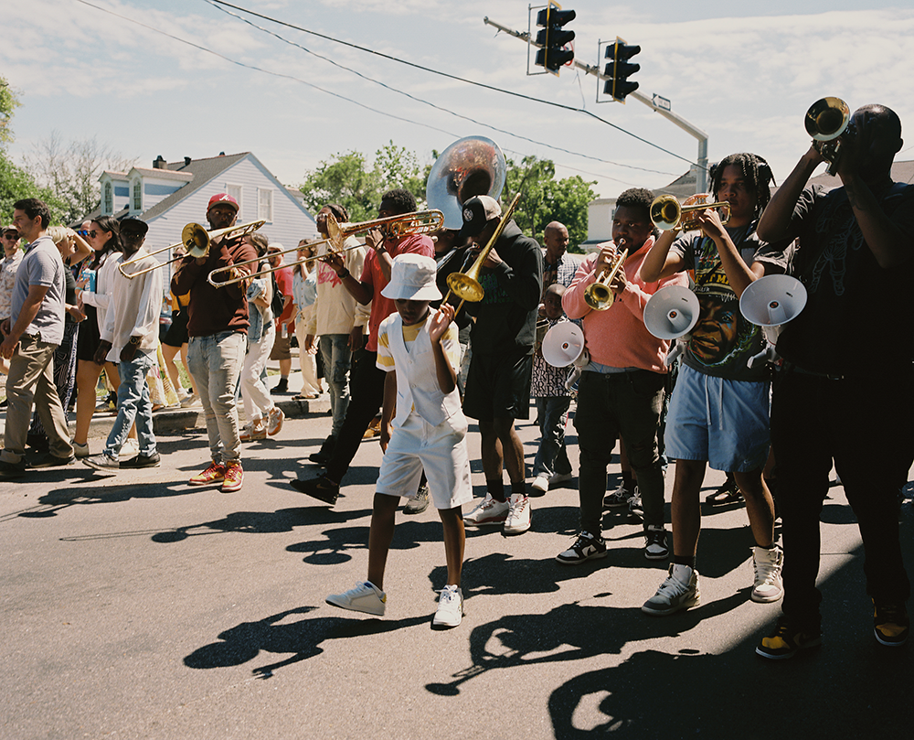 Claiborne Avenue, Tremé. A young stepper leads the way for a brass band. Claiborne Avenue once served as the cultural heart of Tremé, with dozens of businesses and Oak trees lining the street. In order to construct Interstate 10, part of Treme was razed, fracturing the community. Despite this destruction, the street remains a major gathering place for the neighborhood. Photography by Brandon Holland.