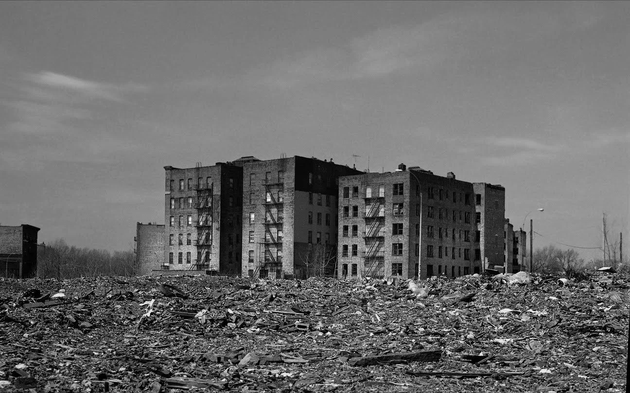 A building surrounded by rubble in the South Bronx during the 1970s, an era of disinvestment—when landlord abandonment, arson, redlining, and the construction of the Cross Bronx Expressway displaced residents and accelerated neighborhood decline.