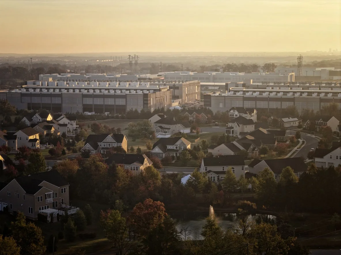An Amazon Web Services data center looms over a residential neighborhood in Northern Virginia. Northern Virginia has the largest concentration of data centers in the world, often called “Data Center Alley.”